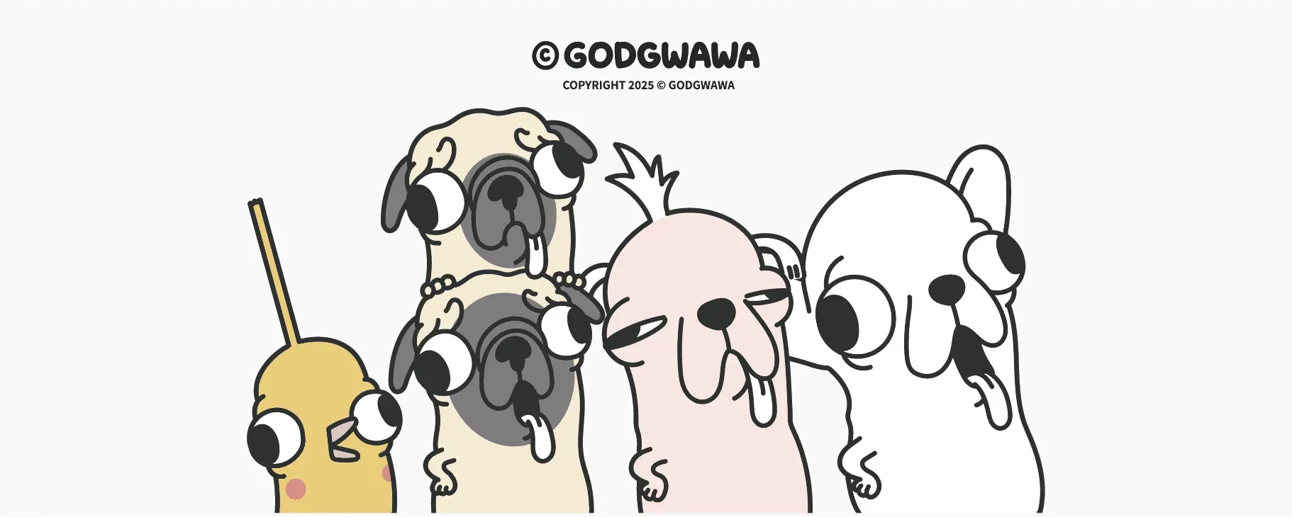 GODGWAWA, the mutant Chihuahua, was born in 2019 and is an original Taiwanese IP character created by the author Gī Lǎo. It is an alien creature with a tongue always hanging out, eyes that cannot focus, and a humanoid body. The Chihuahua can freely transform, commonly taking shapes like the "OK hand sign" or a soft, squishy body. It can also transform into various kinds of animals. In addition to the main character, there are also Gī’s good friends, such as the pug-like alien with "double chins", the alien phoenix with exaggerated long hair, "Bird-Bird", and the alien crested dog with eyes that are always closed, "Ah-Guan".